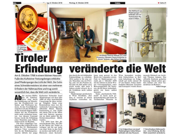 Das erste vollautomatische Museum gibt es nun schon seit 20 Jahren. Auf nicht einmal 20 qm erleben die Besucher eine multimediale Show über das Leben des Nähmaschinenerfinders Josef Madersperger. Seit seiner Eröffnung ist es beliebter Anlaufpunkt für die Bevölkerung und Besucher Kufsteins.